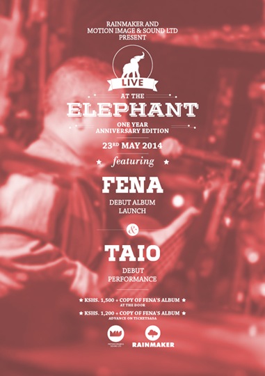 This Saturday, Rainmaker and motion image and sound limited presents Live at the Elephant. Get to celebrate their 1 year anniversary and also get to enjoy a dose of Fena Gitu and Taio's album release and performance respectively. Adfvance tickets which is a copy of Fena's album, go for 1200 bob and the ticket at the gate is 1500.