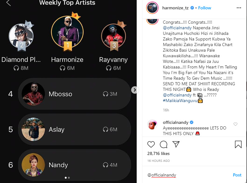 “Congrats...!!! Congrats..!!!! @officialnandy Napenda Jinsi Unajituma Huchoki Hizi ni Jitihada Zako Pamoja Na Support Kubwa Ya Mashabiki Zako Zinafanya Kila Chart Zikitoka Basi Unakuwa Pale Kuwawakilisha....!!! Wanawake Wote...!!! Katika Nafasi za Juu Kabisaaa...!!! From My Heart I'm Telling You I'm Big Fan of You Na Nazani it's Time Ready To Gev Dem Music ...!!!!! SEND TO ME DAT…. RECORDING THIS NIGHT Who is Ready @officialnandy ft ...?????” Harmonize posted.