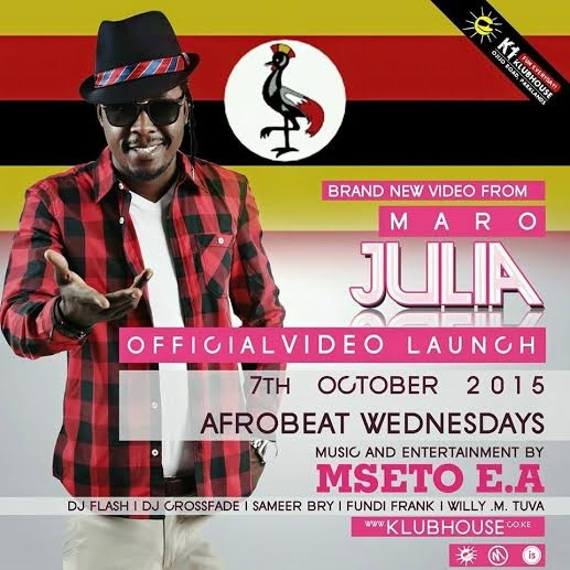 The top Ugandan male vocalist MARO famed for hits like ’Mubbi Bubbi’ & ’Kamboyine’ is in Nairobi today to launch his highly anticipated Julia Video at K1 Wednesday night powered by #MsetoEA. Let's party at Club Tribeka tonight for more surprises!