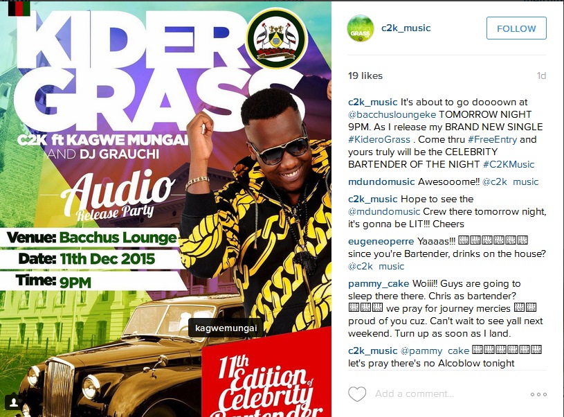 Up and coming rapper C2K is dropping a new hit titled ‘Kidero Grass’ tonight and the place to be is at Bacchus lounge for the audio release launch.