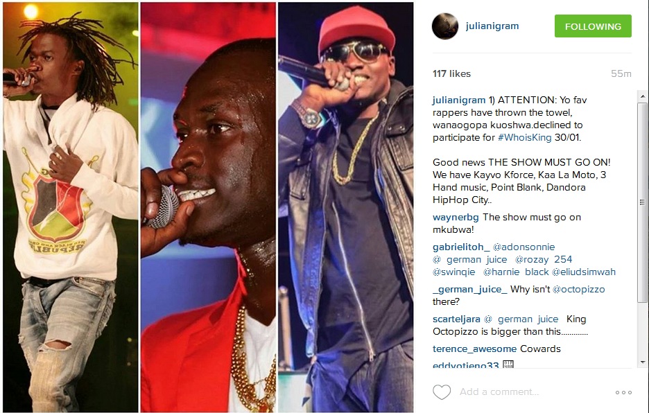 “ATTENTION: Yo fav rappers have thrown the towel, wanaogopa kuoshwa.declined to participate for #WhoisKing 30/01,” he wrote.