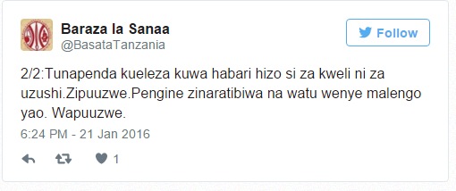Kupitia ukurasa wao wa Twitter BASATA limekanusha taarifa hizo na kuwataka wananchi kupuuza habari hiyo;