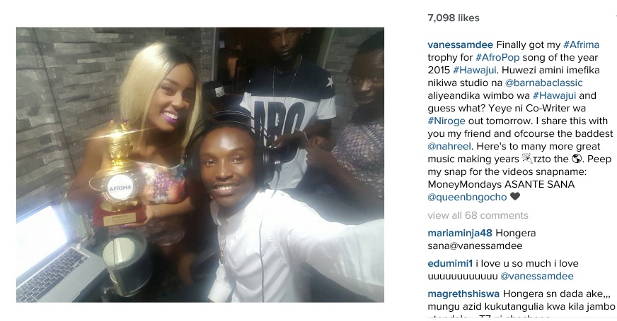 Vanessa amemzungumzia muandishi wa nyimbo zake kama ‘Hawajui’, ‘Siri’ pamoja na huu uliotoka leo hii March 24, ‘Niroge’ kwa kumpost msanii mwenzake Barnaba Classic kupitia mtandao wa Instagram na kuandika: “Finally got my #Afrima trophy for #AfroPop song of the year 2015 #Hawajui. Huwezi amini imefika nikiwa studio na @barnabaclassic aliyeandika wimbo wa #Hawaju and guess what? Yeye ni Co-Writer wa #Niroge out tomorrow. I share this with you my friend and ofcourse the baddest @nahreel. Here's to many more great music making years