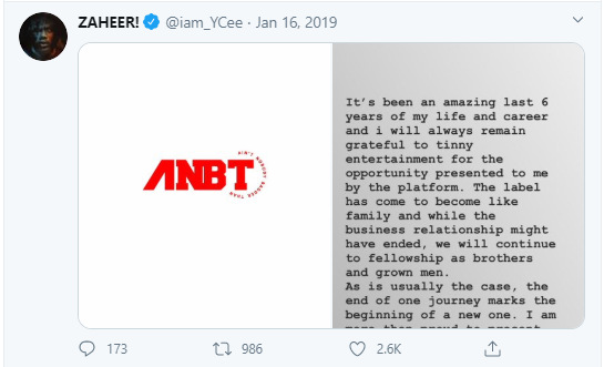 Ycee finally left the label that brought him into limelight Tinny Entertainment on January 15, 2019, to start his own ANBT(Ain’t Nobody Badder Than) Company.